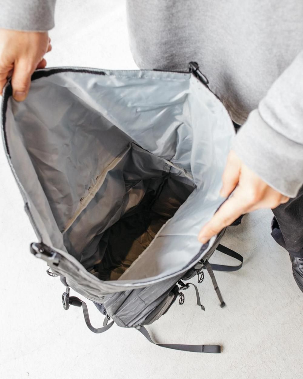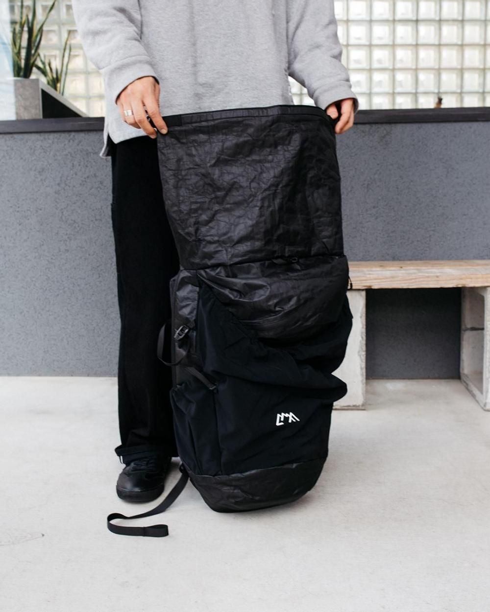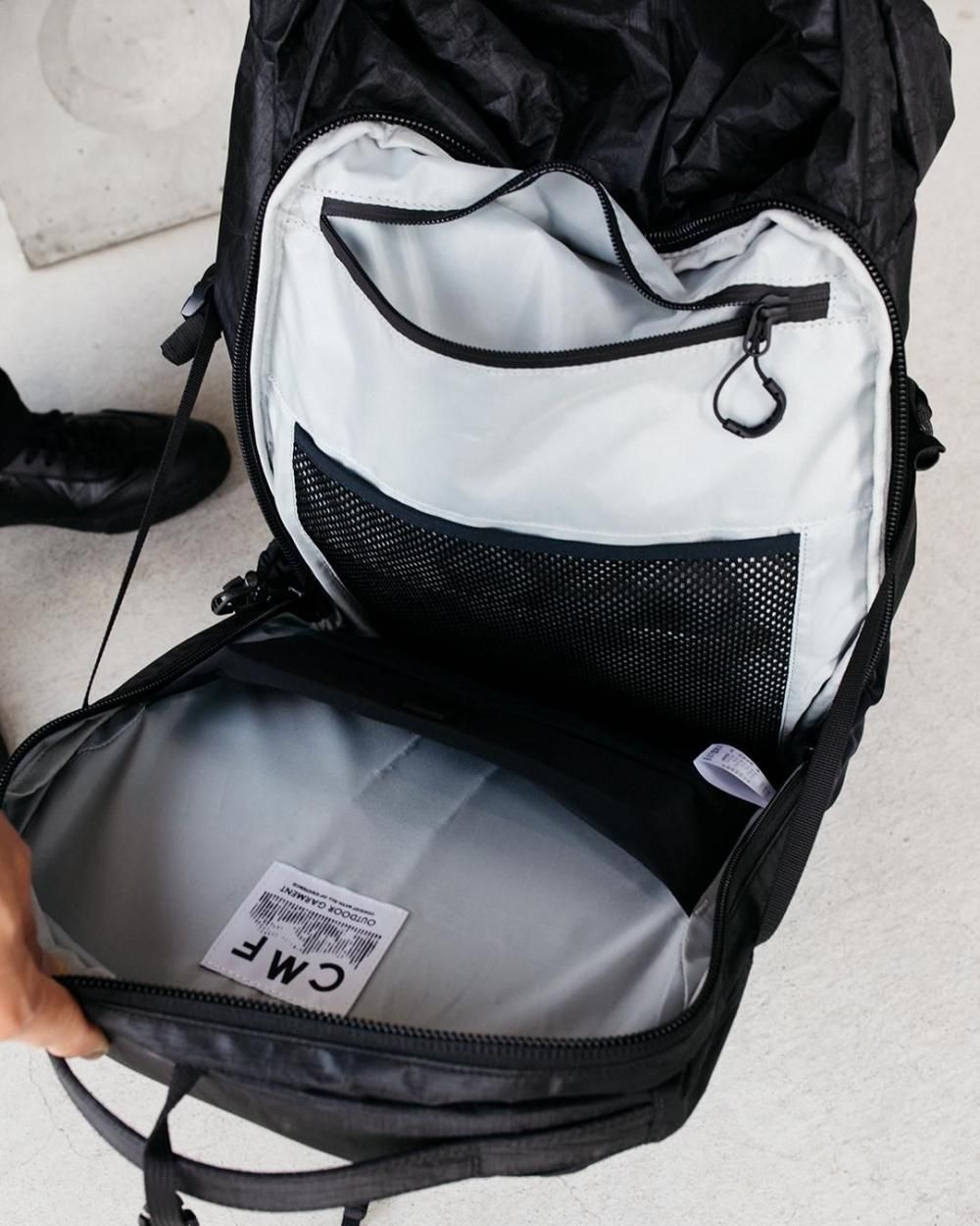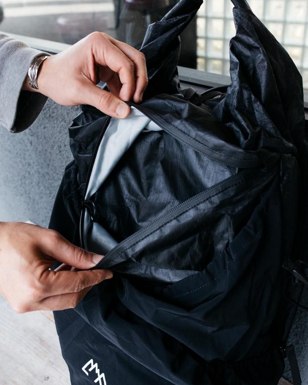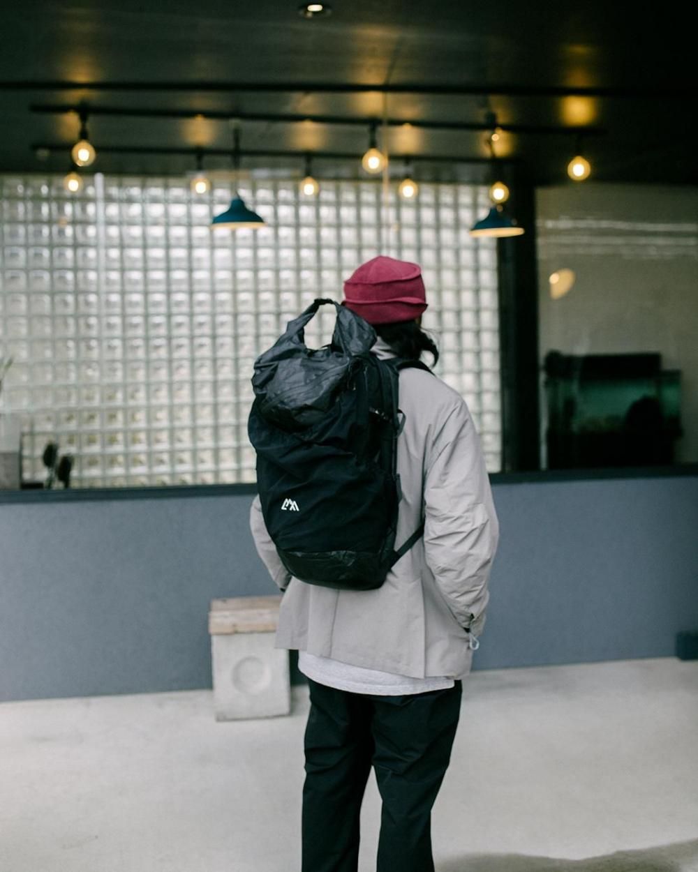 2.5oz DYNEEMA を使用し、前部分のポケットにはヘルメットも入るように容量は大きくしてある。ハイドロ用のポケットはPCスリーブとしても使用可能。
