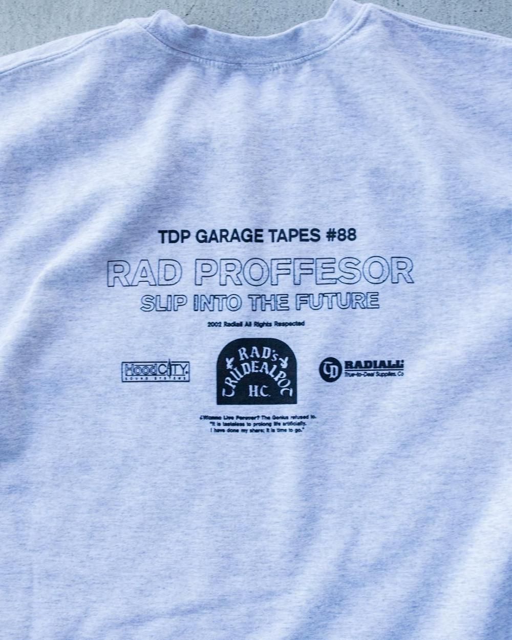 25SSで好評だった「E=MC2」のグラフィックが摺り切りのラバープリントで入り、着込むほどにさらにひび割れや掠れが増し、自分だけのヴィンテージへと育っていく過程を楽しめます。