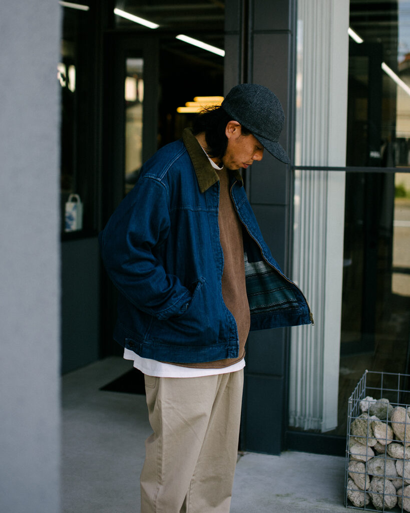 表地には耐久性の高いデニム、襟にはコーデュロイ素材を採用し、裏地にはブランドオリジナルのメキシカンジャガード生地を使用しています。