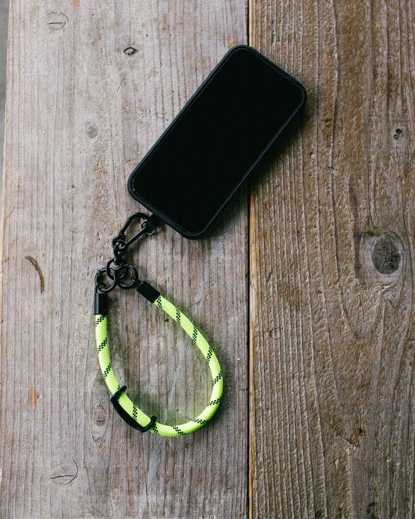 クライミングロープを使用した、スマートフォンやデジタルカメラに装着できるハンドストラップです。